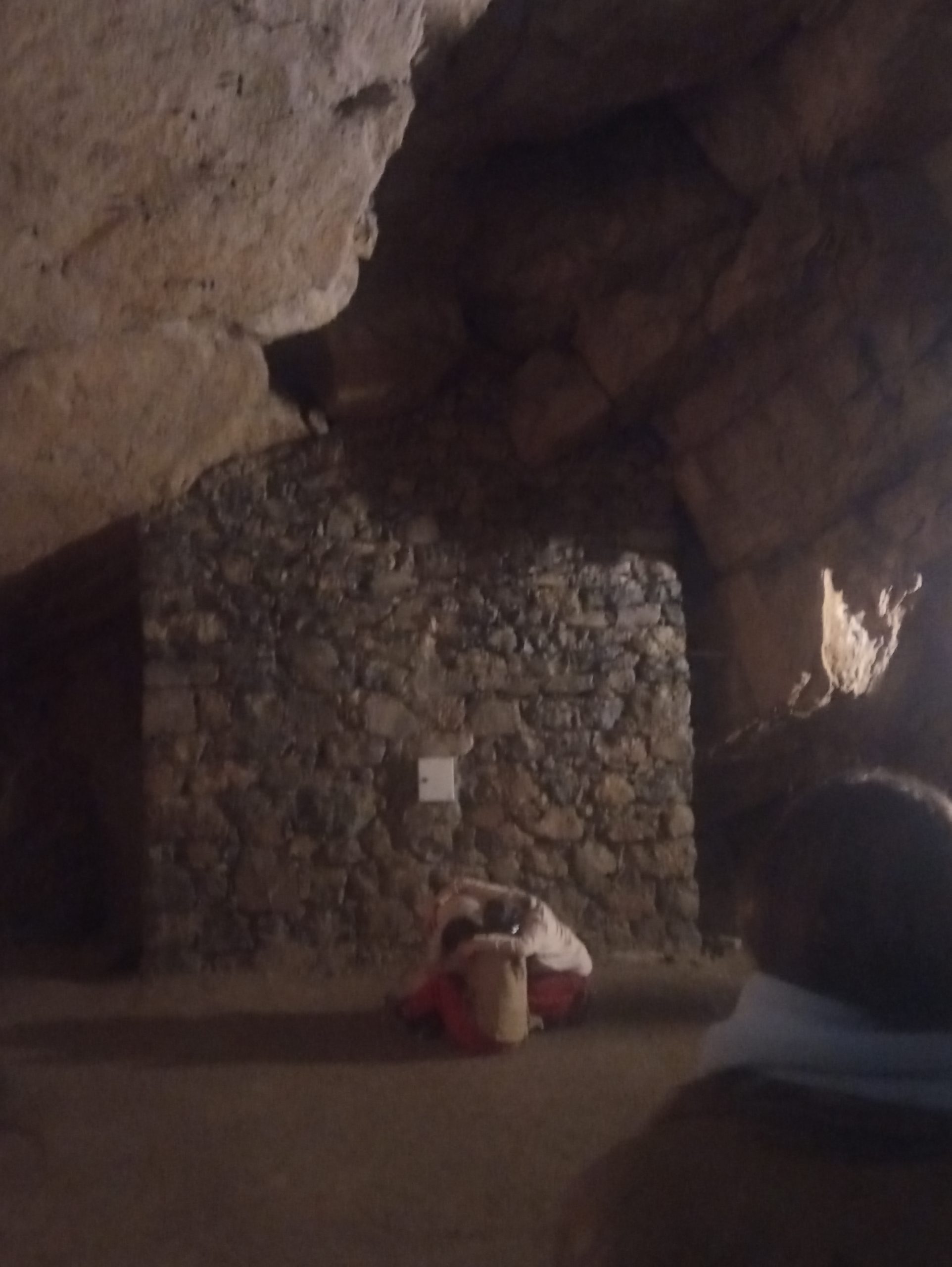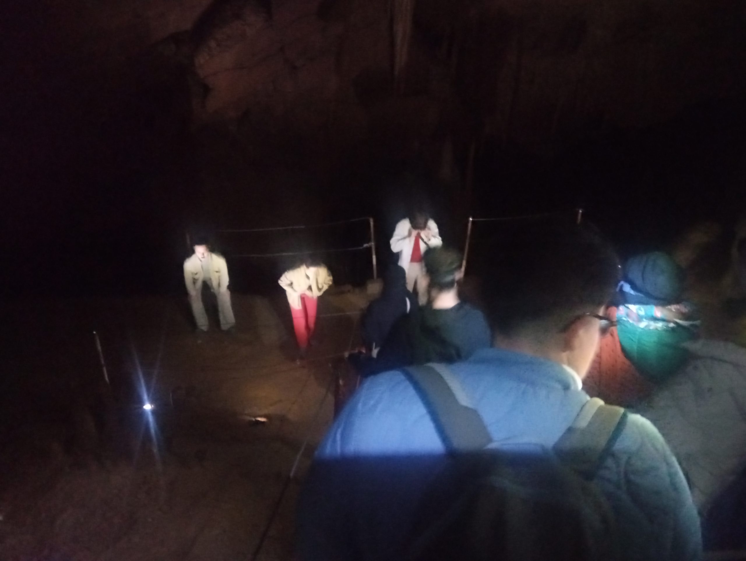 Po nekaj prehojenih metrih smo prispeli do četrte postaje, ki je predstavljala največjo dvorano, znotraj katere smo lahko s svetilkami razločili posamezne veličastne stalagmite in stalaktite – znotraj nje sicer ni bilo nobenega jezera (kasneje sem izvedela, da se v jami nahaja še ena dvorana s stoječo vodo, ki pa zaenkrat ni namenjena obiskovalcem), je pa bila zvočno in energijsko izjemno “ojačana” in primerna za skupinsko točko s kamenčki. Postopoma smo po vzoru performerjev ugašali čelne svetilke in jih tlačili v žepe, nato pa spontano poprijeli za dva kamna in z njima udarjali drug ob drugega. Izkušnja je še najbolj spominjala na neandertalski vzgib prižiganja ognja ali pa klesanja kamna kot tudi na iskanje skupnega ritma ob premagovanju tišine in goste teme. Nekaj, kar je na začetku zvenelo kot iskanje lastnega zvočnega izraza in ritma, se je že čez nekaj trenutkov prelevilo v skupinski uigrani ritem, ki je spominjal na kovinski zvok rudarskega izkopavanja, ki so se mu čez čas pridružili tudi neartikulirani glasovi, za katere se zdi, da so prišli iz najglobjih plasti duše, ki v sebi skrivajo pristno žalost, osamljenost pa tudi željo po pripadnosti, ritualu in katarzi. Tako kot se je spontano ta kolektivni zvočno-gibalni akt začel, tako je tudi spontano ugasnil in luči so se ena za drugo spet prižgale in nas vodile nazaj v civilizacijo. Preden smo odšli iz jame na plano pa smo na poti še opazovali koreografijo performerjev, ki so ves čas hodili pred nami, za nami ali med nami, dokler jih nenadoma nismo ponovno zagledali v prvi dvorani, strmeče vsak v svoj kot – ena je bila naslonjena k steni z netopirji, drugi je stoje strmel v enega izmed virov svetlobe, tretja je čepela sklonjena za ogromnim kapnikom, četrta je zrla proti izhodu. Na prvi hip so delovali kot ujetniki v Platonovi votlini, ki se vsak za sebe spopadajo z vprašanji in izzivi, s poudarkom na tem, da celo tisti, ki steguje svoj obraz neposredno proti svetlobi, ne deluje kaj bolj “razsvetljen” ali osvobojen od ostalih, ki ostajajo v območju teme.