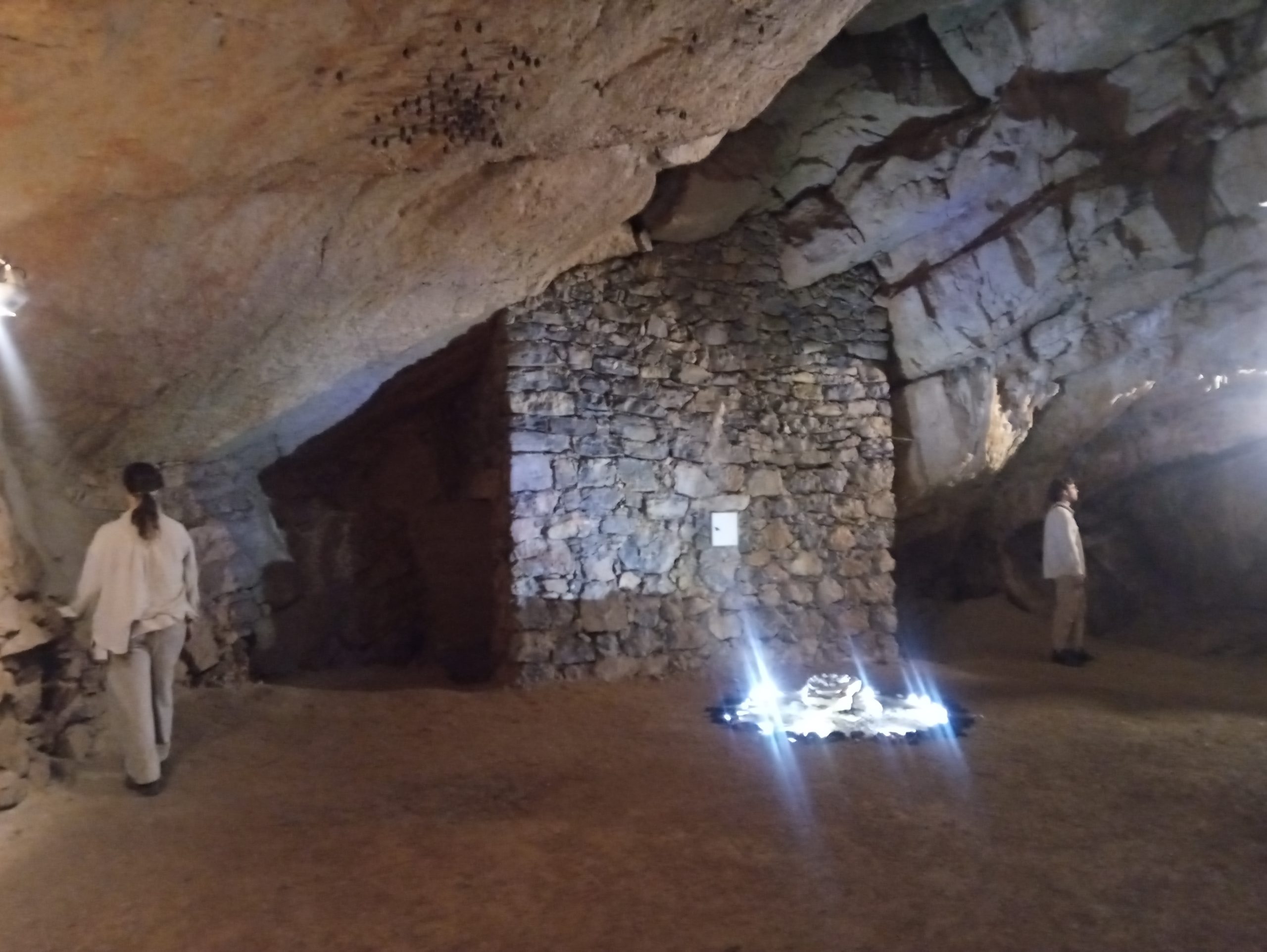 Po nekaj prehojenih metrih smo prispeli do četrte postaje, ki je predstavljala največjo dvorano, znotraj katere smo lahko s svetilkami razločili posamezne veličastne stalagmite in stalaktite – znotraj nje sicer ni bilo nobenega jezera (kasneje sem izvedela, da se v jami nahaja še ena dvorana s stoječo vodo, ki pa zaenkrat ni namenjena obiskovalcem), je pa bila zvočno in energijsko izjemno “ojačana” in primerna za skupinsko točko s kamenčki. Postopoma smo po vzoru performerjev ugašali čelne svetilke in jih tlačili v žepe, nato pa spontano poprijeli za dva kamna in z njima udarjali drug ob drugega. Izkušnja je še najbolj spominjala na neandertalski vzgib prižiganja ognja ali pa klesanja kamna kot tudi na iskanje skupnega ritma ob premagovanju tišine in goste teme. Nekaj, kar je na začetku zvenelo kot iskanje lastnega zvočnega izraza in ritma, se je že čez nekaj trenutkov prelevilo v skupinski uigrani ritem, ki je spominjal na kovinski zvok rudarskega izkopavanja, ki so se mu čez čas pridružili tudi neartikulirani glasovi, za katere se zdi, da so prišli iz najglobjih plasti duše, ki v sebi skrivajo pristno žalost, osamljenost pa tudi željo po pripadnosti, ritualu in katarzi. Tako kot se je spontano ta kolektivni zvočno-gibalni akt začel, tako je tudi spontano ugasnil in luči so se ena za drugo spet prižgale in nas vodile nazaj v civilizacijo. Preden smo odšli iz jame na plano pa smo na poti še opazovali koreografijo performerjev, ki so ves čas hodili pred nami, za nami ali med nami, dokler jih nenadoma nismo ponovno zagledali v prvi dvorani, strmeče vsak v svoj kot – ena je bila naslonjena k steni z netopirji, drugi je stoje strmel v enega izmed virov svetlobe, tretja je čepela sklonjena za ogromnim kapnikom, četrta je zrla proti izhodu. Na prvi hip so delovali kot ujetniki v Platonovi votlini, ki se vsak za sebe spopadajo z vprašanji in izzivi, s poudarkom na tem, da celo tisti, ki steguje svoj obraz neposredno proti svetlobi, ne deluje kaj bolj “razsvetljen” ali osvobojen od ostalih, ki ostajajo v območju teme.